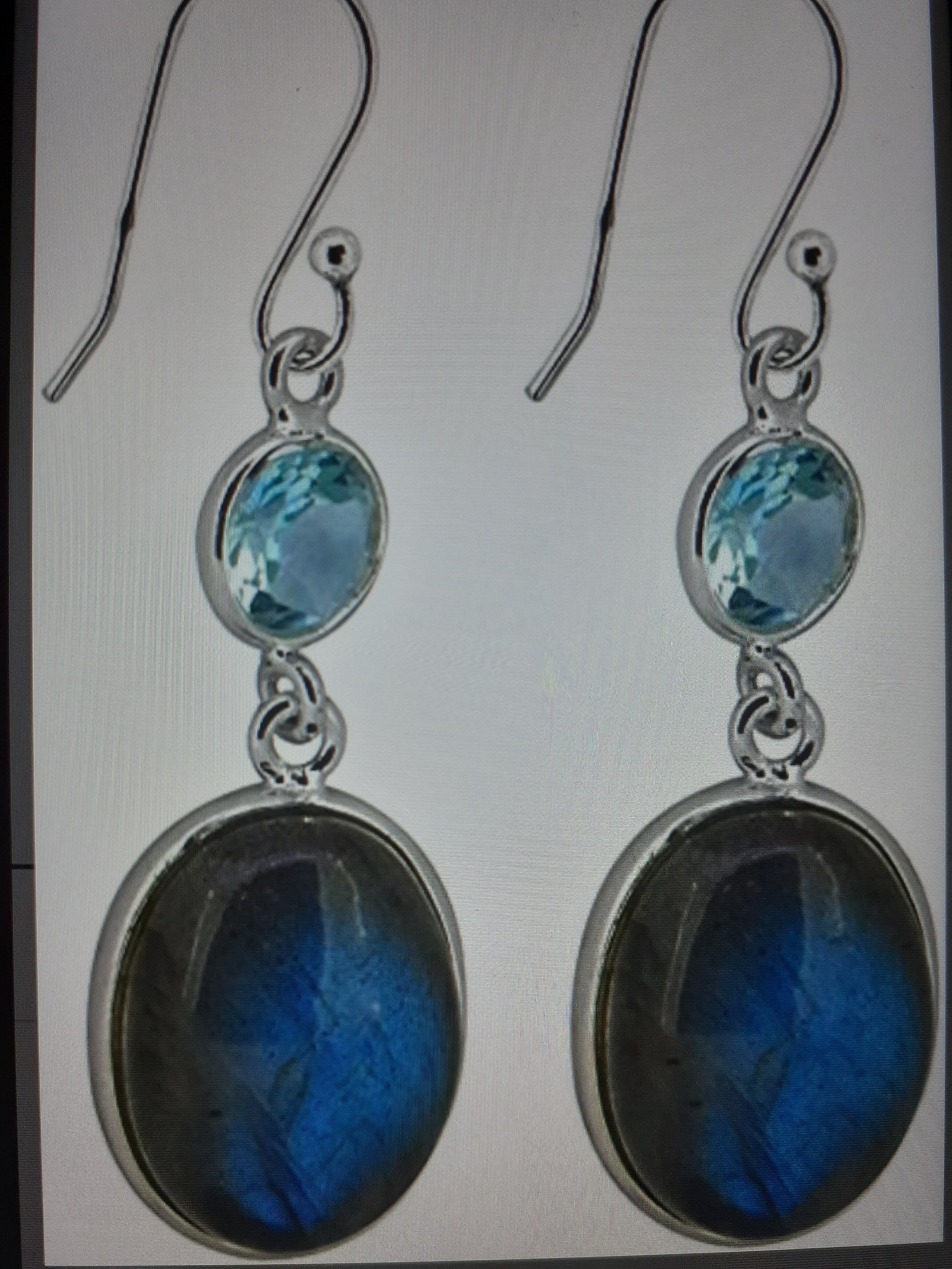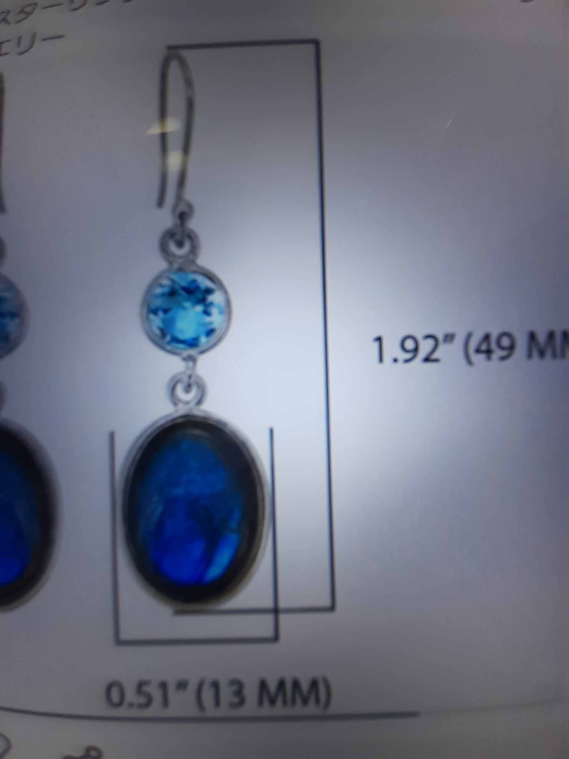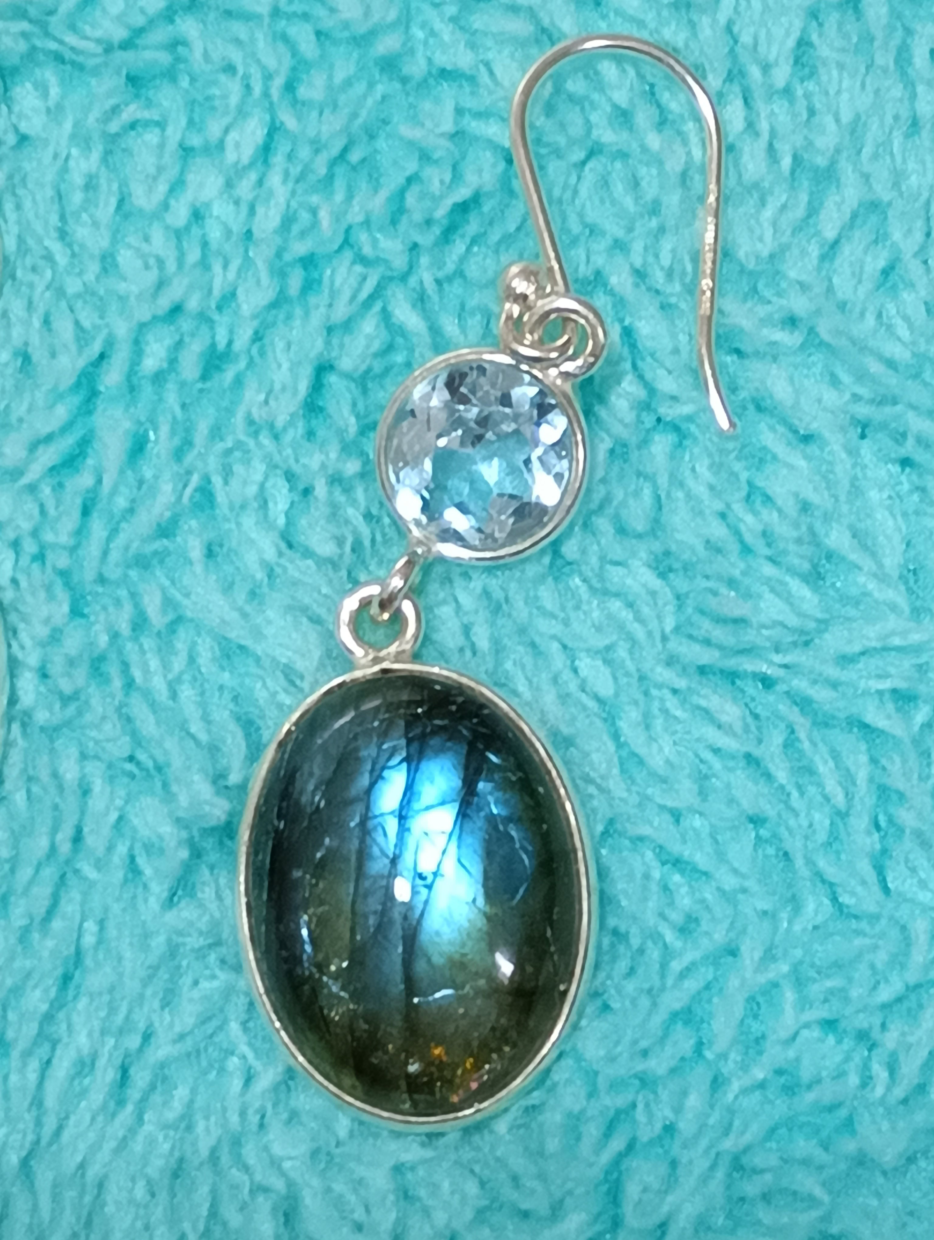 製品仕様:ジェムストーン - ラブラドライト - 未処理、ブルートパーズ- 照射、金属 - 925スターリングシルバー、ストーンサイズ - 12 X 16、7 x 7 mm、製品重量 - 6.4 g、長さ - 1.93インチ。